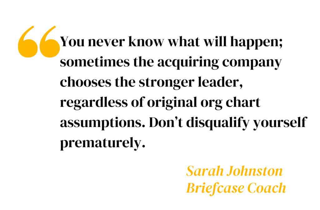 You never know what will happen; sometimes the acquiring company chooses the stronger leader, regardless of original org chart assumptions. Don’t disqualify yourself prematurely.