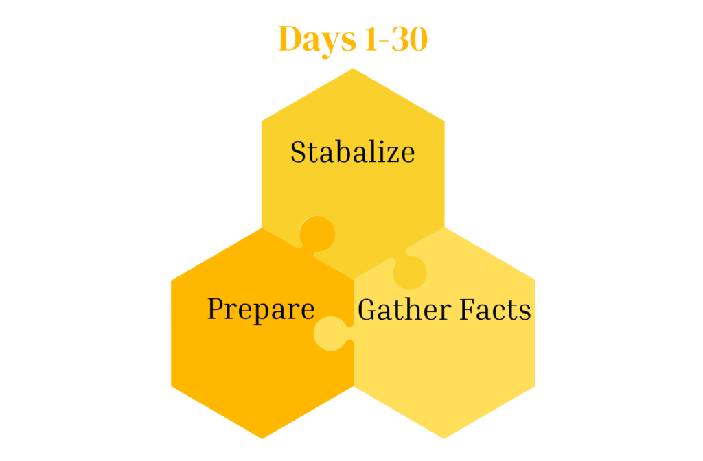 Days 1–30: Stabilize, Prepare, and Gather Facts